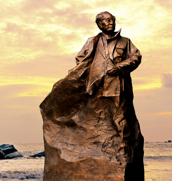 “愈益完美”是在雕塑的情動之美里展現出來,雕塑塑造的并不是個暗啞的人,而是有內中情動,用一種人類崇高的方式表達出來,你可以理解無聲,但卻掩蓋不了洶涌在作品下,洶涌在大陳島開拓者內心的情動,這與雕塑是暗合的,與大陳島亦是暗合。雕塑用“蒙太奇”的手段,將不同的的人物在不同的時間段活動表達銜接。如電影片段,第一尊“墾拓”雕塑是塑以群雕的形式,有人拾起鐵鍬,有人舉起木夯,還有一人喂哺羊羔,眾人都是不遺余力開拓這片疆域。如同雕塑中塑造的旗幟,迎風鼓動,獵獵作響。旗幟的安插,是一種肯定、一種精神的導引,那一群開拓者如同將士,將士只有在一片不毛之地墾拓,而并非在開拓好了的疆域里征戰(zhàn)。大陳島的開發(fā)便也是如此,城市市場飽和,人類情感飽和的狀態(tài)下,大陳島的開發(fā)是勢之趨,大陳島的未來便也如下面的雕塑,是一種觀望,如第二尊“觀望”雕塑,以山體為型,然卻在這之中的變化間,塑造了一尊老人的面容,他在眺望,眼神深邃堅定,內中透有濃濃的情感,似在望那遲歸的捕魚人,而老人旁邊同樣鑄造一個小男孩,他在看,他海的那邊會是什么,看海上升騰起的紅日,看歸來的父母。對美好事物的信仰,這片土地,寄托的是開拓者的信仰,他們堅信,在努力之下必定結出碩果,而那第三尊“濠濮間想”雕塑便是他們眼中的美好,他們未來生活的境遇會是這樣一幅諧和的畫面,一妙齡少女坐在海邊礁石上,有海鷗逐浪翻涌,人物與自然界相擁,物我相忘。