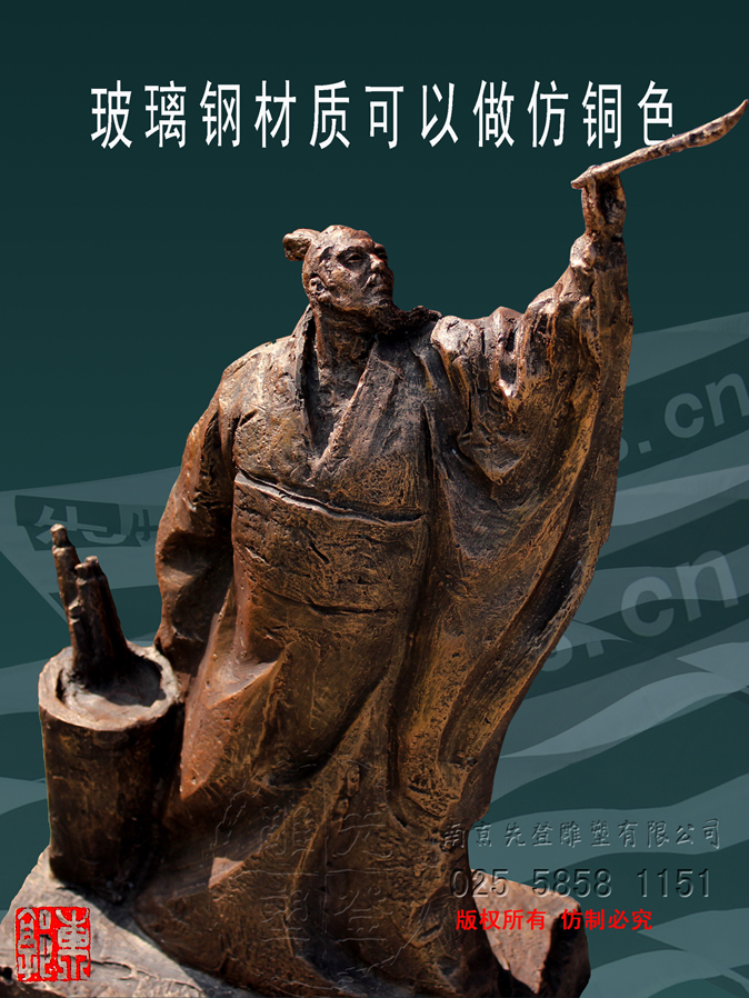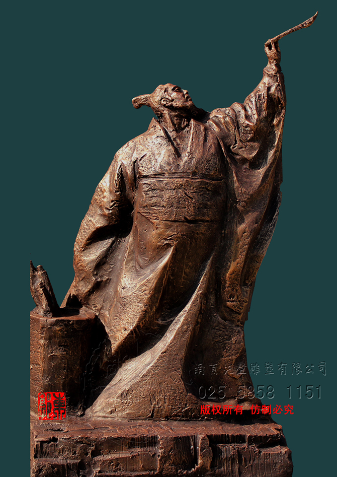 張芝字伯英,出生官宦之家,幼時高操,勤習學書,朝廷賞識,令他做官,而他并非貪圖高官厚祿,甘做布衣。素日臨池學書,得崔杜之法,復而變之,遂成“今草”。張芝對書藝癡醉令人驚嘆。衛恒《四體書勢》里有言“凡家之衣帛,必先書而后練之。臨池學書,池水盡墨。”張芝對于書法藝術的不斷索求,終成一代“草圣”,當是“為世所寶,寸紙不遺”。雕塑里張芝如平日習作,但見他揚手,握管,在虛空中縱姿揮毫,一如其書法,一筆而就,不拖沓凝滯,衣袍素袖宛如字之體勢婉轉流暢,舒箋觀鳥跡,研墨染魚緇。