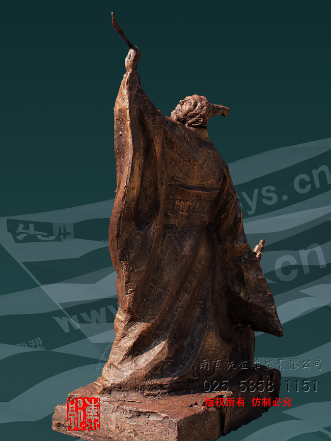 雕塑作有與無,寫色表現空,以物質的有表現無與息,是有“天風浪浪,海山蒼蒼。真力彌滿,萬象在旁”。雕塑里頭,人物形體概況詳實,清癯的面容,碩長的身姿,著一襲衣衫浮動,自是風清日里吞吐大荒,真境逼而神境生,滿目里卻皆是山蒼木秀,水活石潤,大自然的生息。再者看張芝揚手舉面,凌空中書寫,筆在而帛錦無,筆墨有無間,取大自然造化,吸盡西江,一筆當空書長卷。寫盡的是人事浮華,寫山河秀麗,寫日居月諸,寫去到日月山川里。寫盡了生命的飛揚與物的安定。